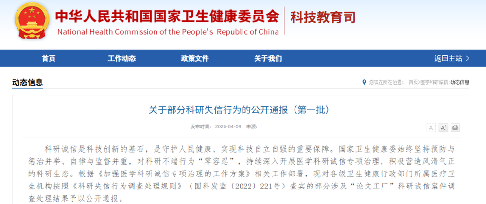 4月9日,国家卫健委官网通报一批涉及“论文工厂”科研诚信案件调查处理结果。